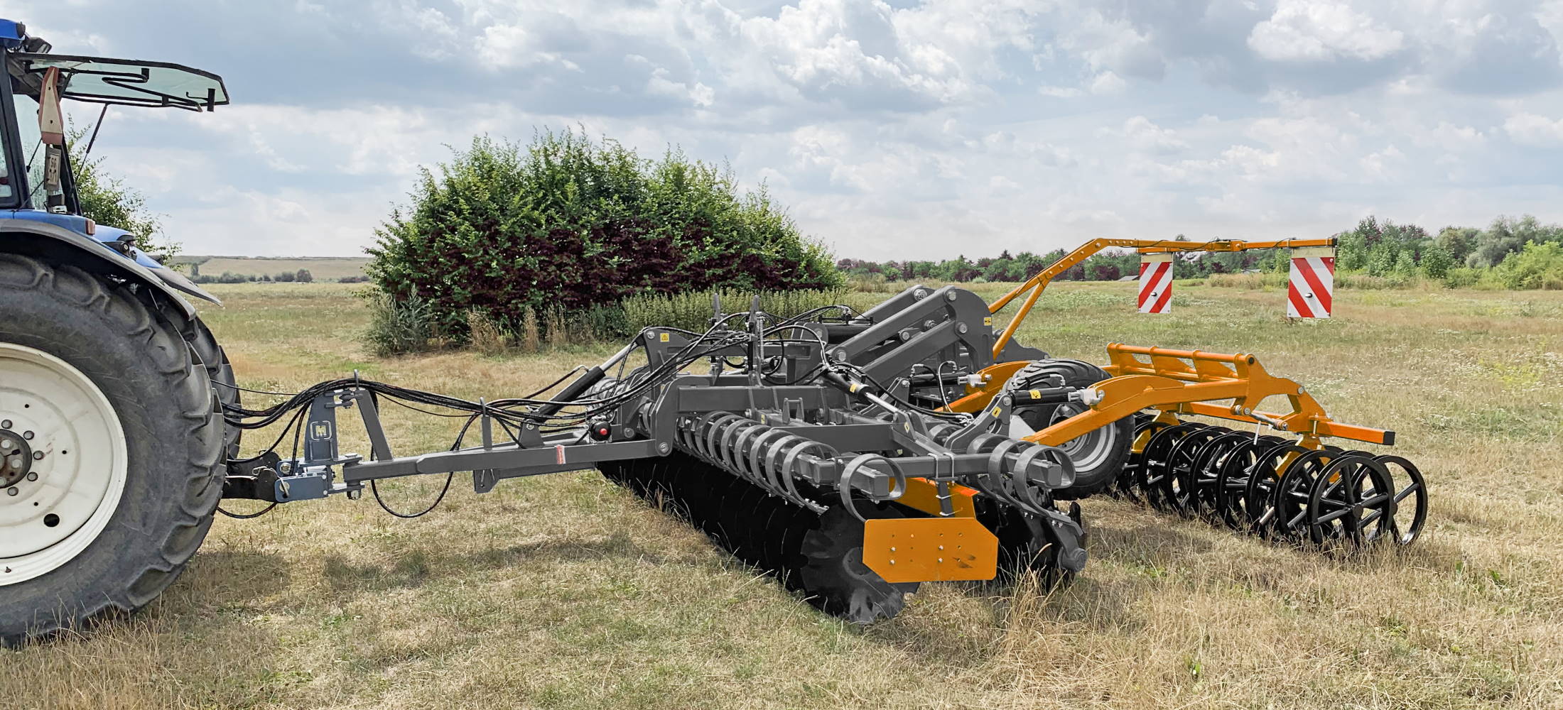 Based on three section frame, where middle section has a built in hitch frame, while two side frames are folding by use of hydraulic cylinders. HYBRO comes in working widths
