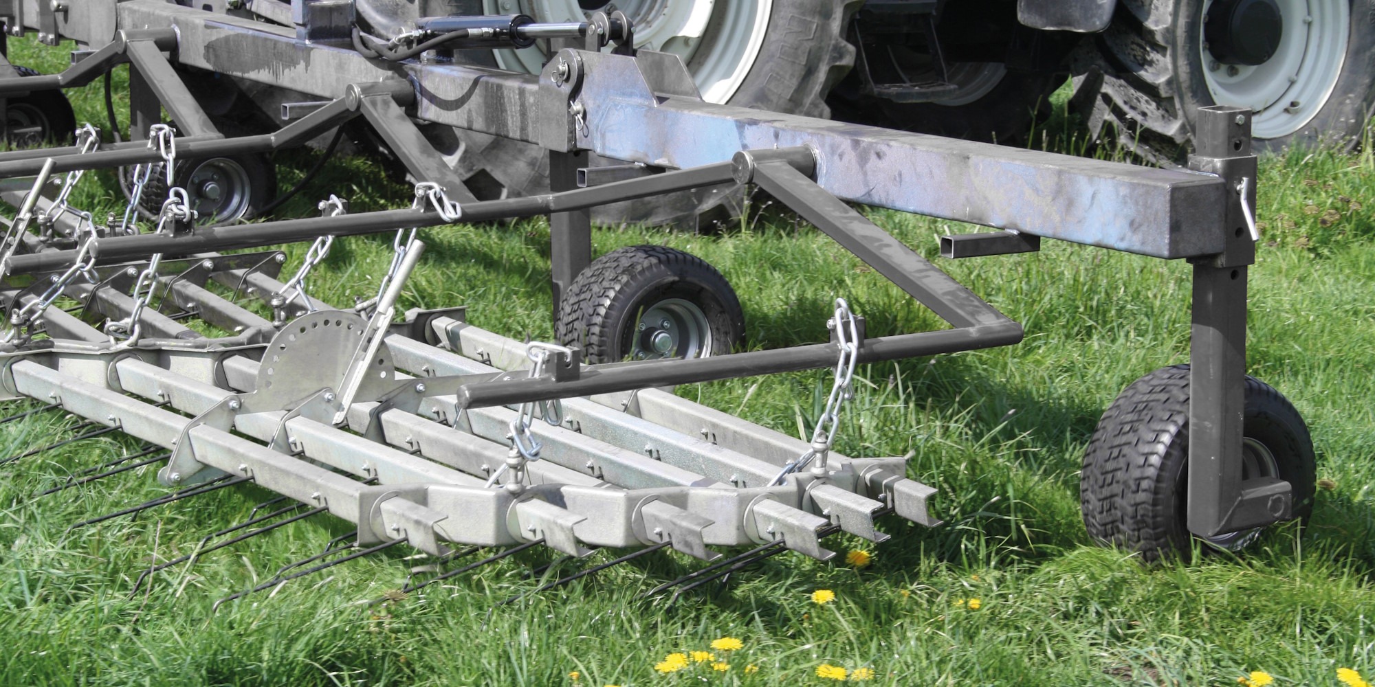 – 3,4,6 and 8 meter. There are two working sections of the machine. Three row drag harrow comes first, hanged freely from top of the frame, to provide great ground copying and lots of clearance. Drags are followed by three row tine section. Equipped with 10 mm thick, height adjustable spring tines, allows stepless adjustments of the machine. While at work, first drag subsection is responsible for leveling the surface, smoothing animal excrements and removal of molehills. Tine section rakes and cleans the meadow. It also improves air and water circulation which stimulates a growth, eliminates weeds and prepares the surface for seeding. Working with HYBRO provides optimal and complete grassland and meadow care.