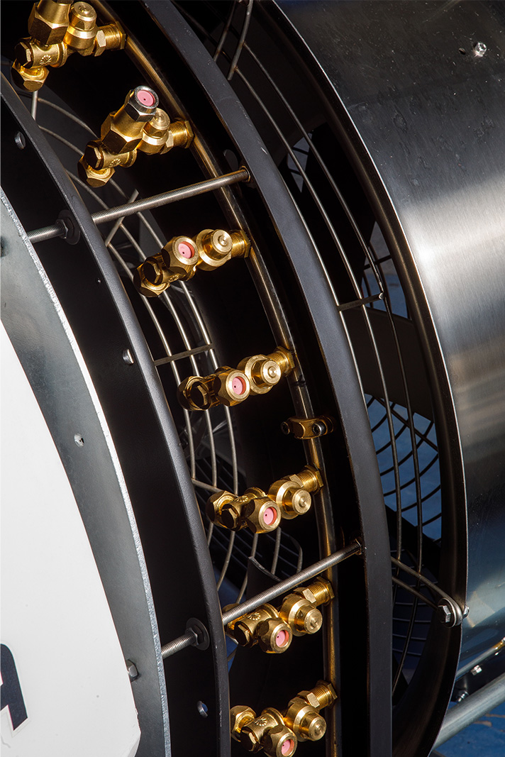 - Przewody opryskowe ze stali nierdzewnej z 24 dyszami antykapaniowymi, wspomaganymi powietrzem z armatki z wieloma wylotami.