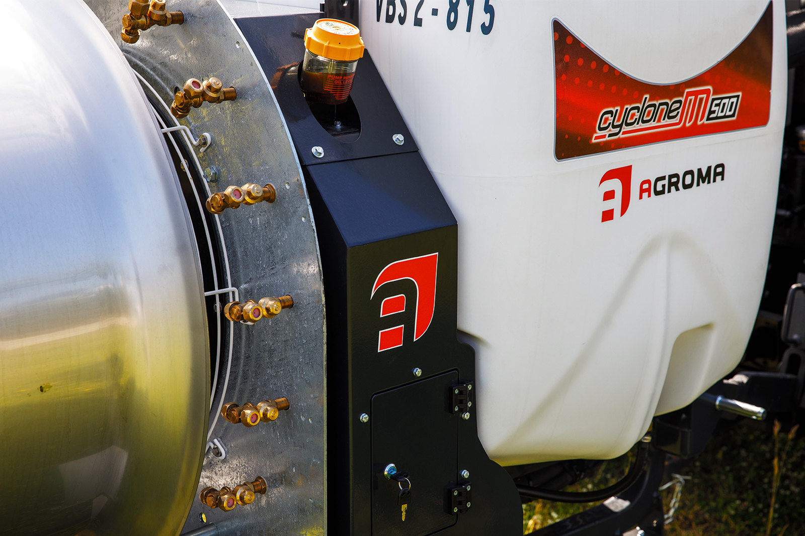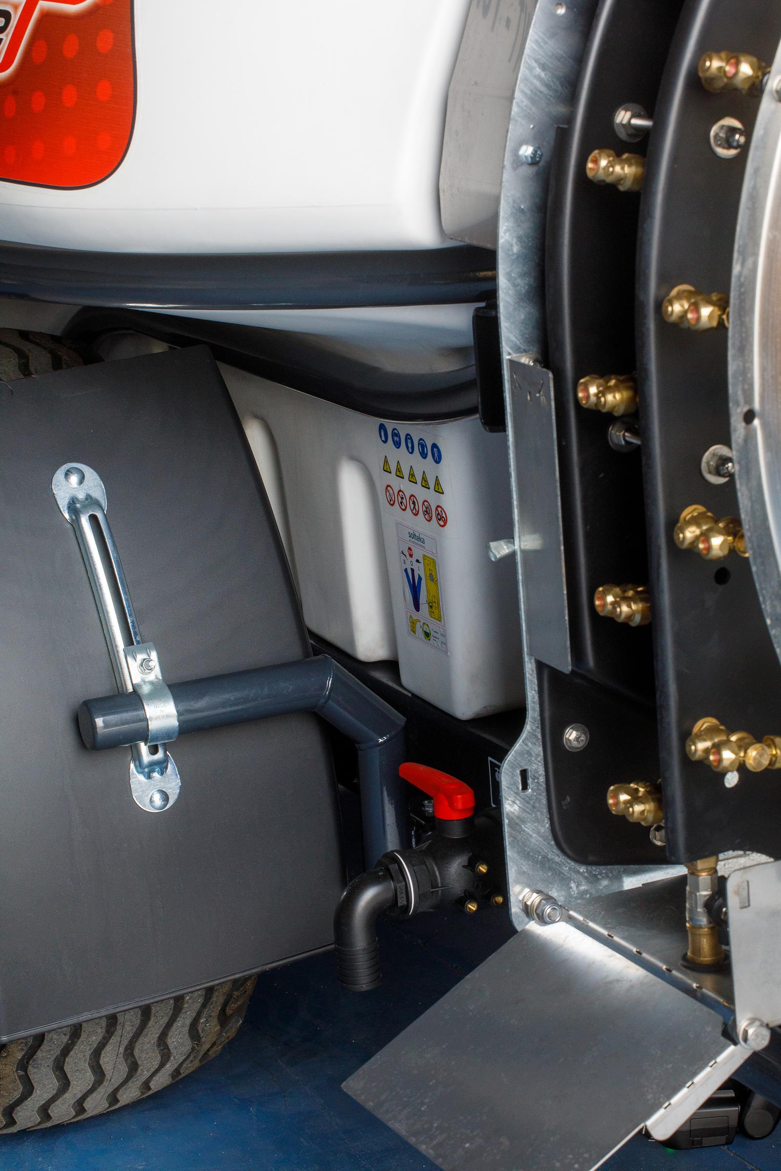 - Panel boczny z zaworami do oprysków i czyszczenia.
