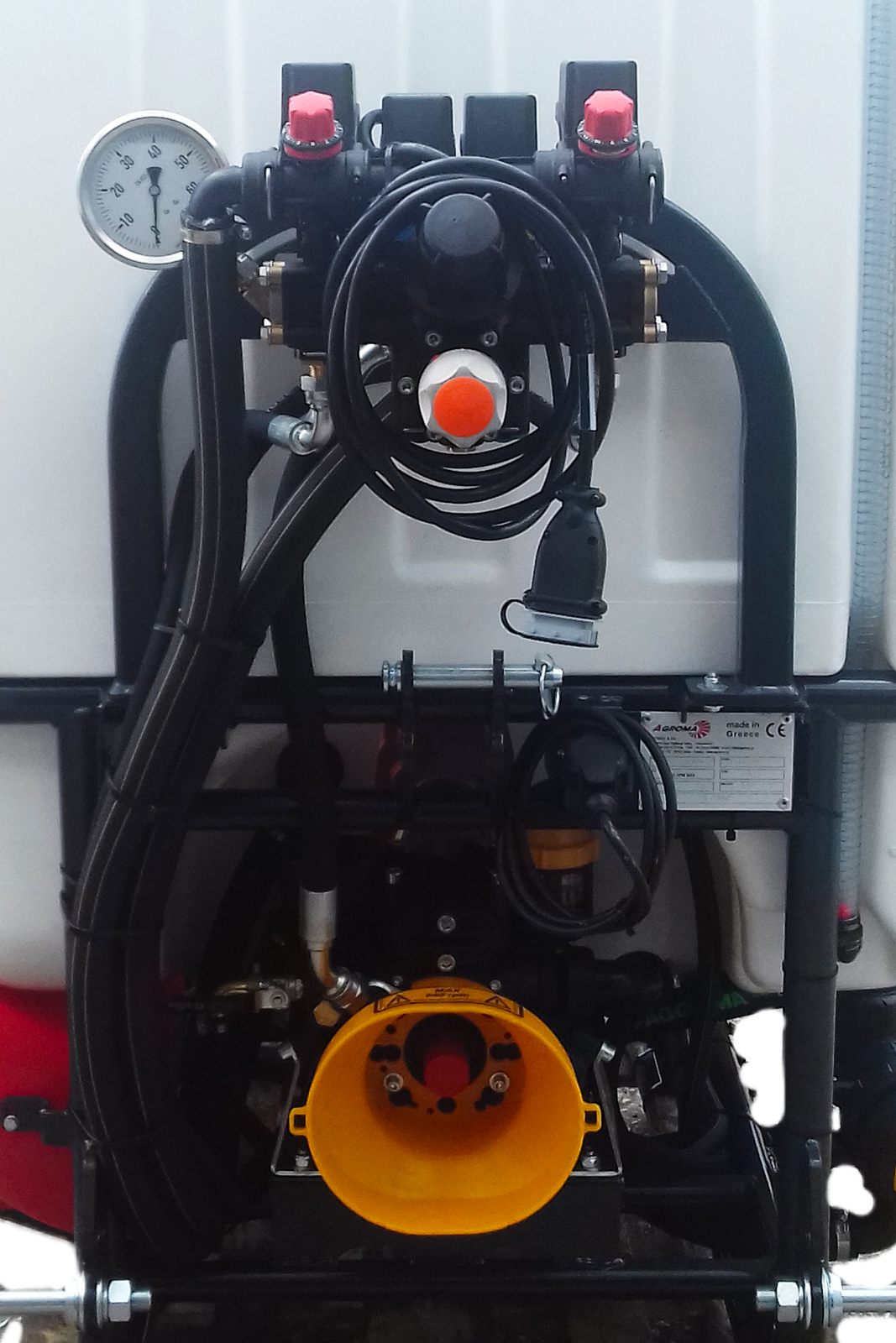 - Zawory spustowe i punkty podłączenia ręcznej lancy opryskowej.